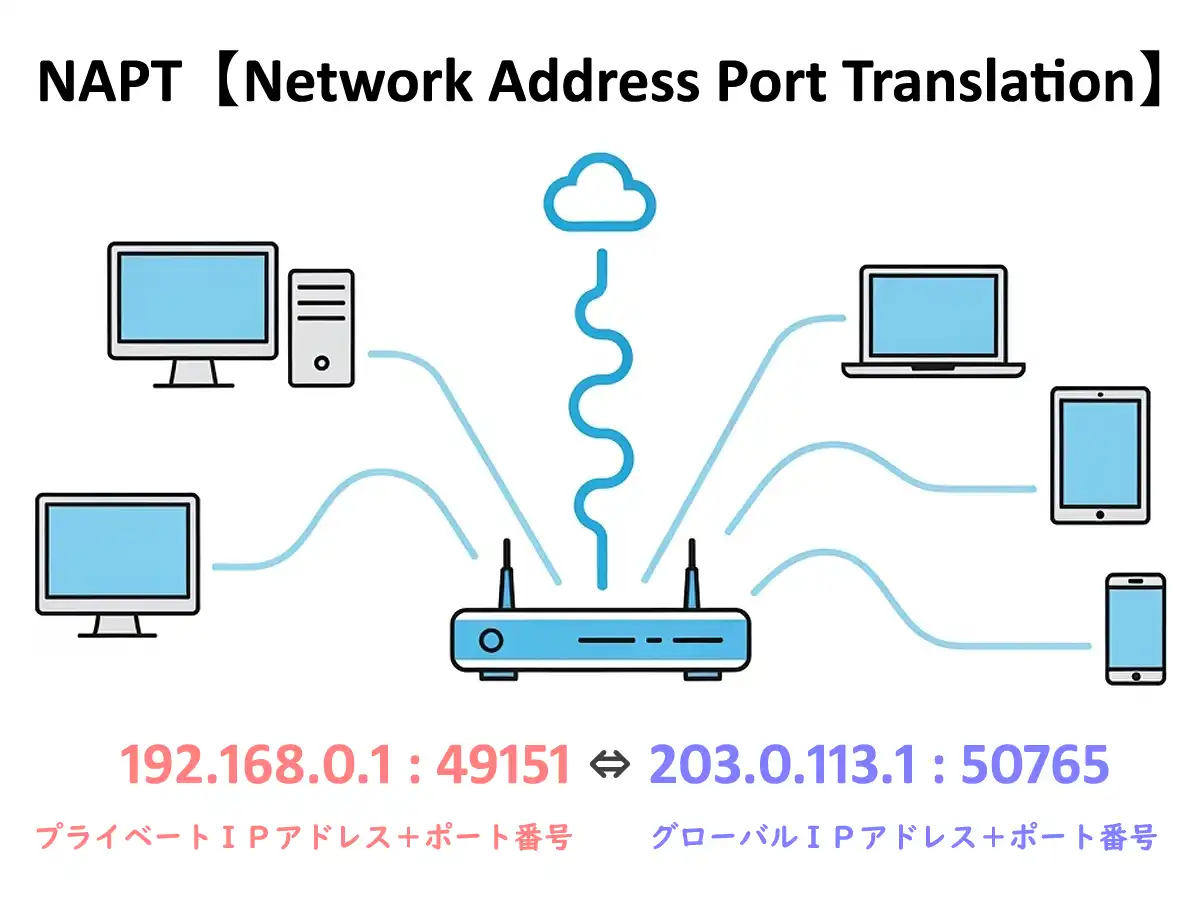 NAPTはネットワーク境界上にあるルータなどの中継装置が持つ機能で、プライベートアドレスとグローバルアドレスの相互変換を自動的に行い、ローカル側の機器があたかもインターネットに直接繋がっているかのようにアクセスできるようにする。